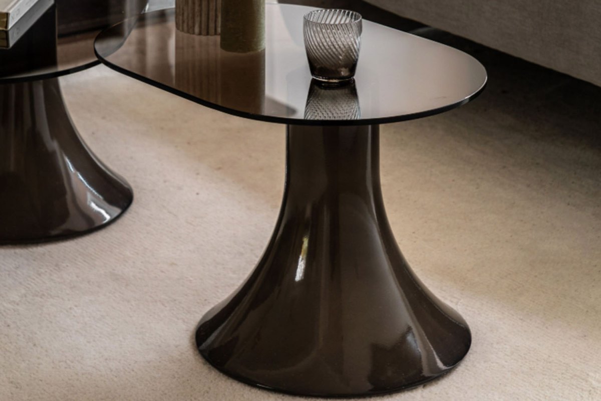 The Atzara Large Side Table is designed with a contemporary Italian influence and a subtle retro edge, offering a stylish addition to modern interiors. The distinctive flared base is crafted from reinforced glass concrete and finished in a rich charcoal brown glaze, creating a bold yet refined look. Topped with toughened glass featuring a soft brown tint, this piece adds depth and sophistication while maintaining a light, elegant feel. Perfect as a compact side table, it works beautifully beside a sofa or chair to complete your living space.