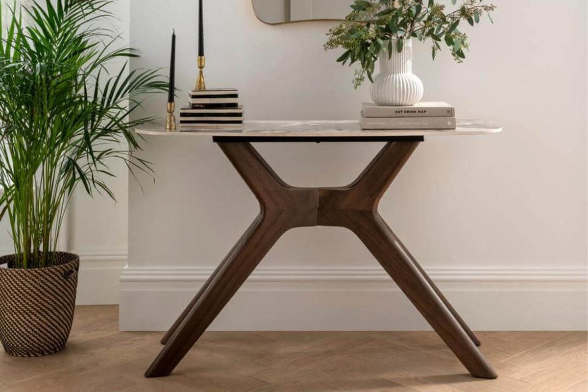 The Avellino Console Table is a refined accent piece designed to elevate contemporary living spaces. Crafted with solid birch legs and a beautifully finished walnut veneer, it offers a warm, modern look that suits a wide range of interiors. The sintered stone tabletop adds a distinctive, elegant touch while providing durability for everyday use. Part of the wider Avellino collection, this console table allows you to effortlessly mix and match coordinating dining and occasional pieces to create a cohesive, stylish home.