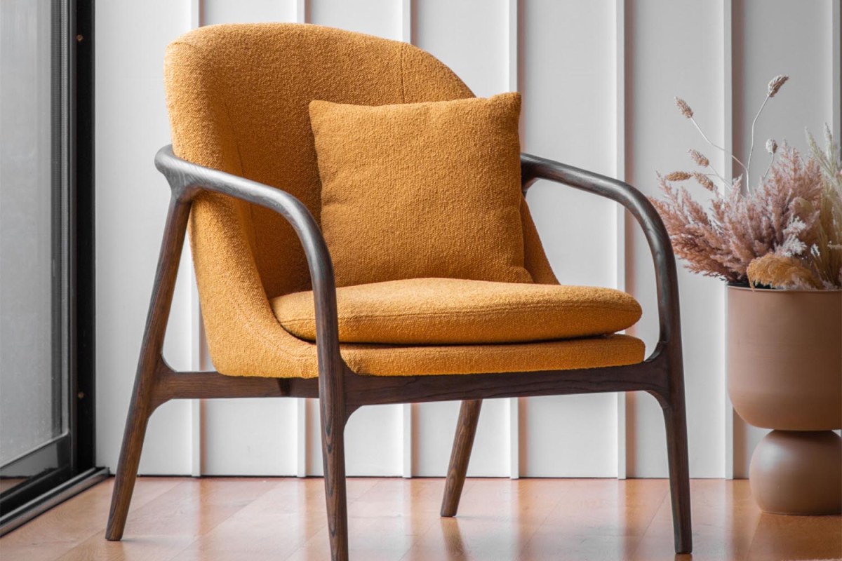 A contemporary take on Mid-Century design. The Avery Armchair features a beautifully hand-curved dark wood frame that wraps around the seat, creating a sleek, sculptural silhouette suited to both modern and vintage-inspired spaces. Available in two fabric options, a bold retro yellow ochre or a soft neutral taupe, each finish highlights the striking wood profile in its own unique way. With a padded seat and supportive back cushion, Avery delivers comfort with unmistakable character.