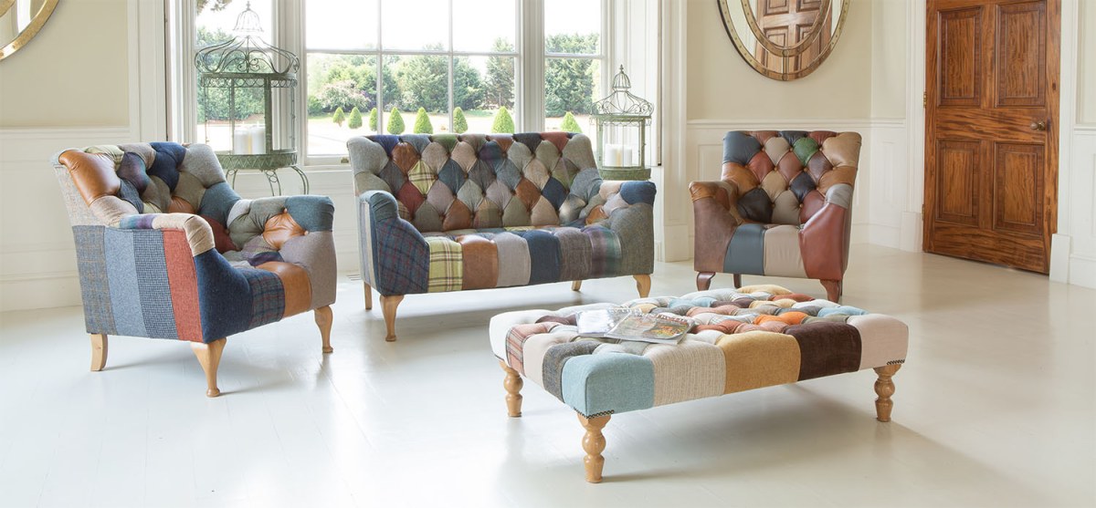 A delightful button back armchair, expertly upholstered in a patchwork mix of wool and real leather. The idea arose from a desire to use the offcuts of material that accumulate when making upholstery, and it has proved a gem of an idea and the result is a range of very desirable, and totally unique pieces.
