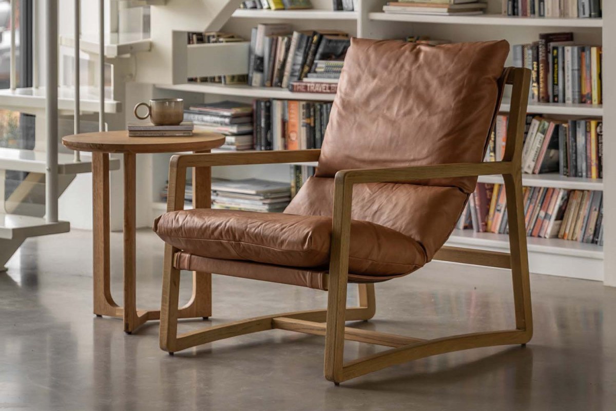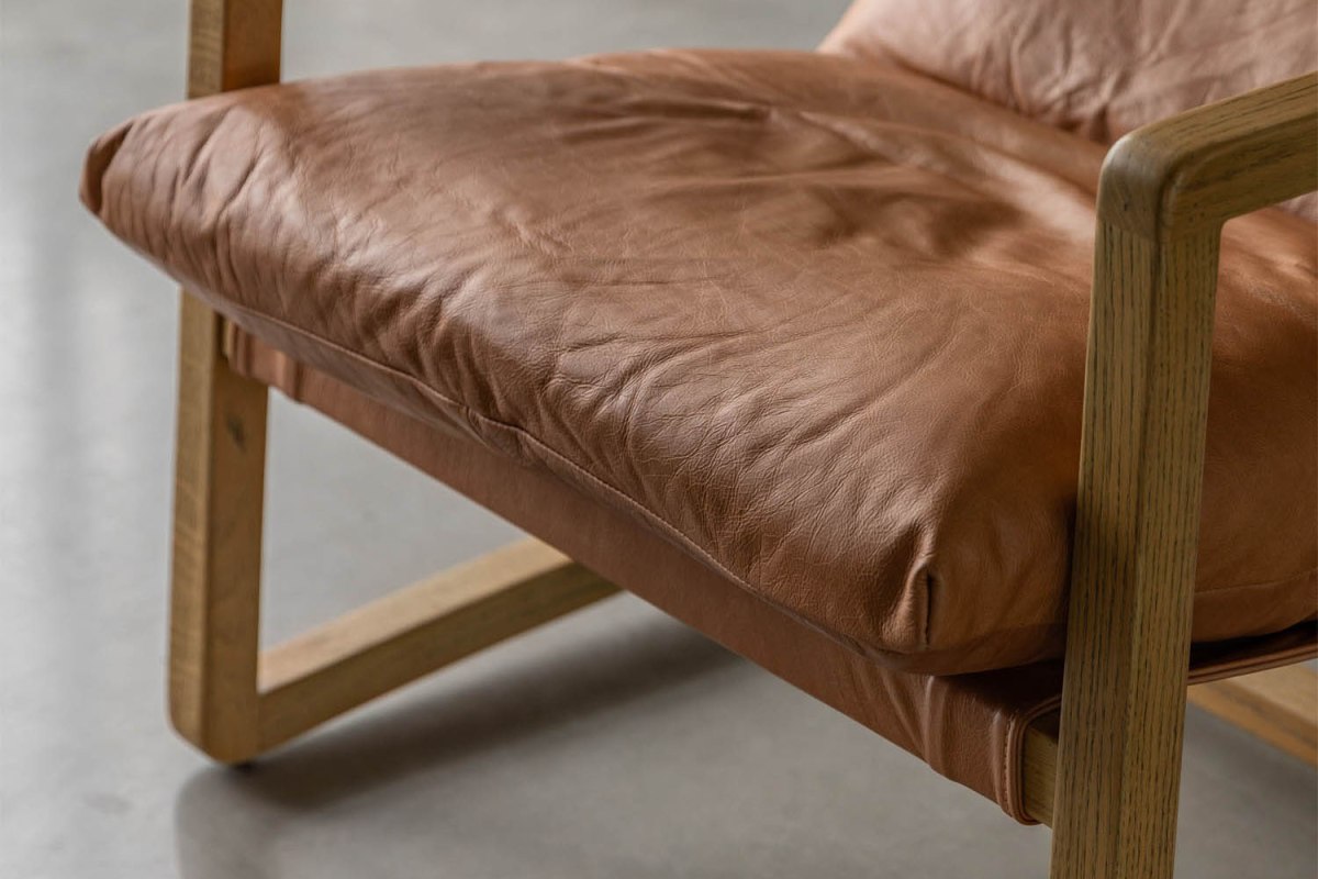 Relax in style with this beautifully designed lounge chair. Upholstered in vintage brown leather and paired with a light wood frame, it offers a warm, inviting look that suits a wide range of interiors. The gently reclined seat and cushioned design provide a comfortable place to unwind, while the clean lines keep the overall look effortlessly stylish.