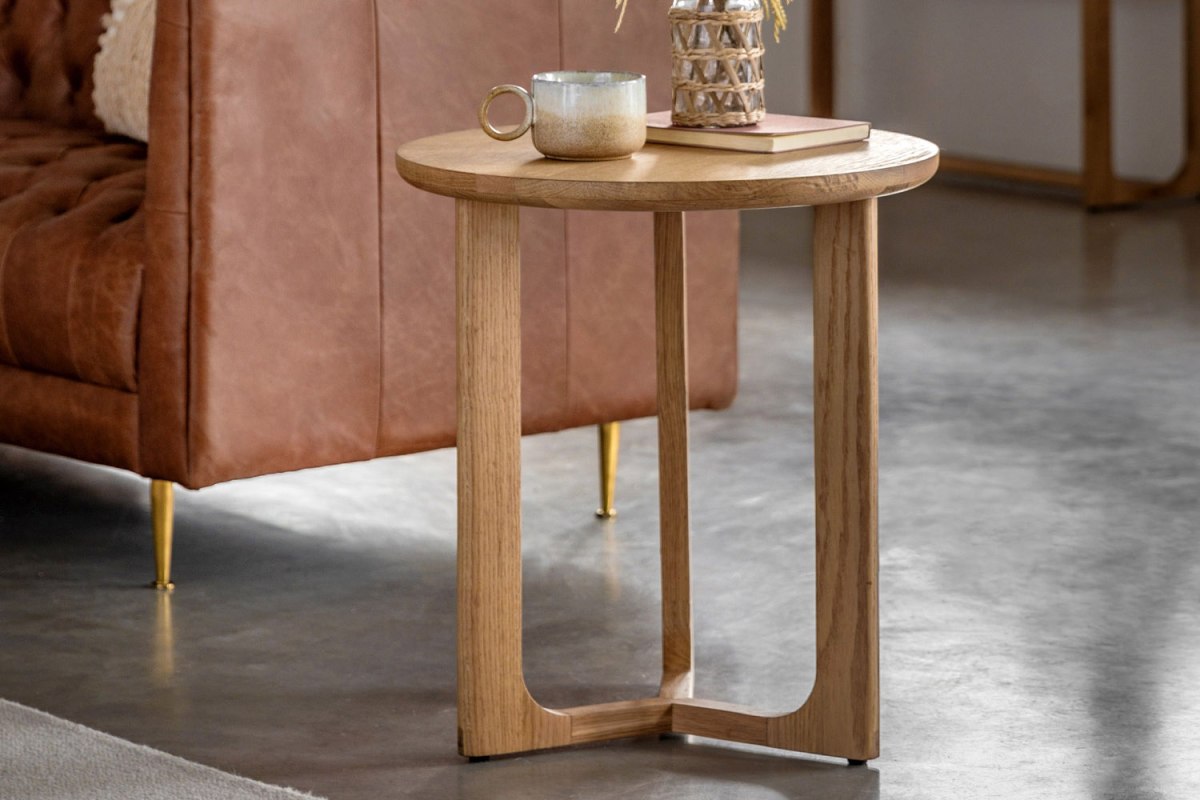 Elegant and understated, the Cadoc Natural Oak Side Table is beautifully crafted from the finest solid oak, with structural oak veneers used where practical. The simple round tabletop is paired with a gracefully shaped underframe, creating a refined look that works effortlessly in a variety of interiors. Finished in natural oak to highlight the warmth and character of the wood grain, it’s perfect beside a sofa, armchair or bed.