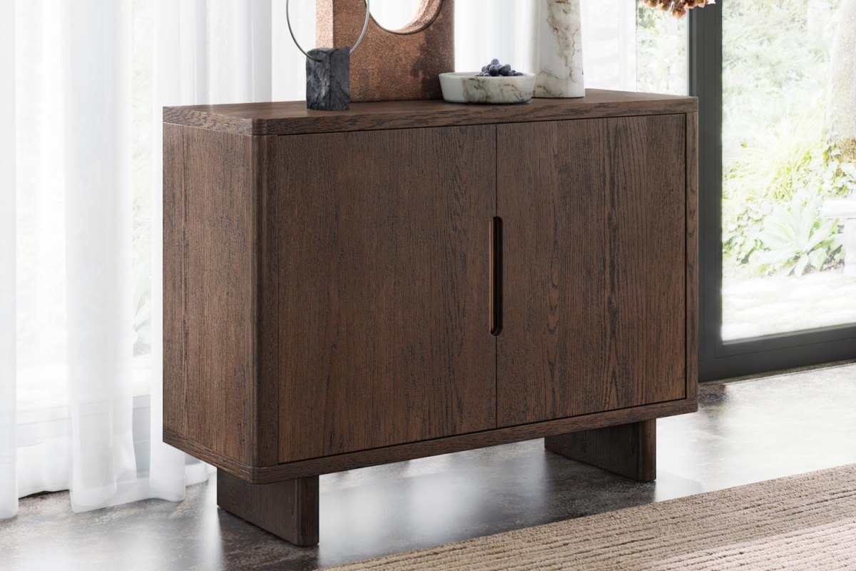 The Carmel Small Sideboard is a compact and stylish storage piece, crafted from dark sandblasted oak that gives the wood a rich textured finish with real depth and character. The natural grain is beautifully enhanced, creating a distinctive look that adds warmth to any room. The handleless cupboard doors are complemented by a subtle brass backplate, adding a touch of contrast while maintaining a clean appearance. Perfect for smaller spaces, the Carmel Small Sideboard offers practical storage while bringing the distinctive style of the Carmel collection into your home.