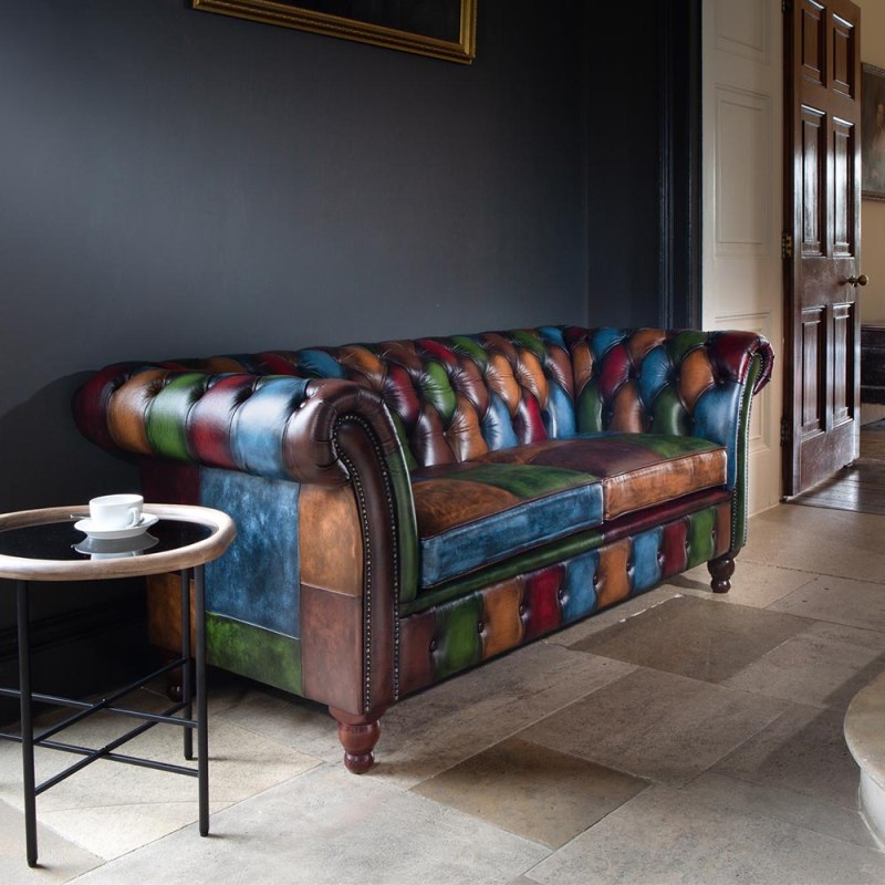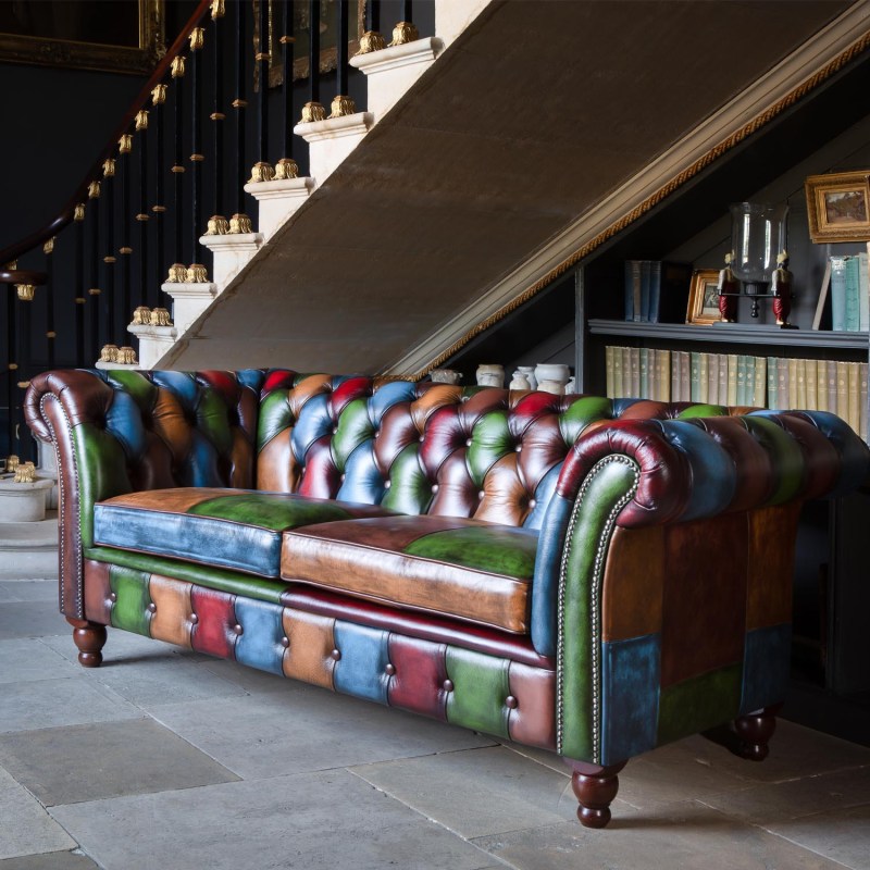 The Chalfield has a classic Chesterfield design and is expertly upholstered in real leather in a mix of colours. The idea arose from a desire to use the offcuts of material that accumulate when making upholstery, and it has proved a gem of an idea and the result is a range of very desirable, and totally unique pieces.