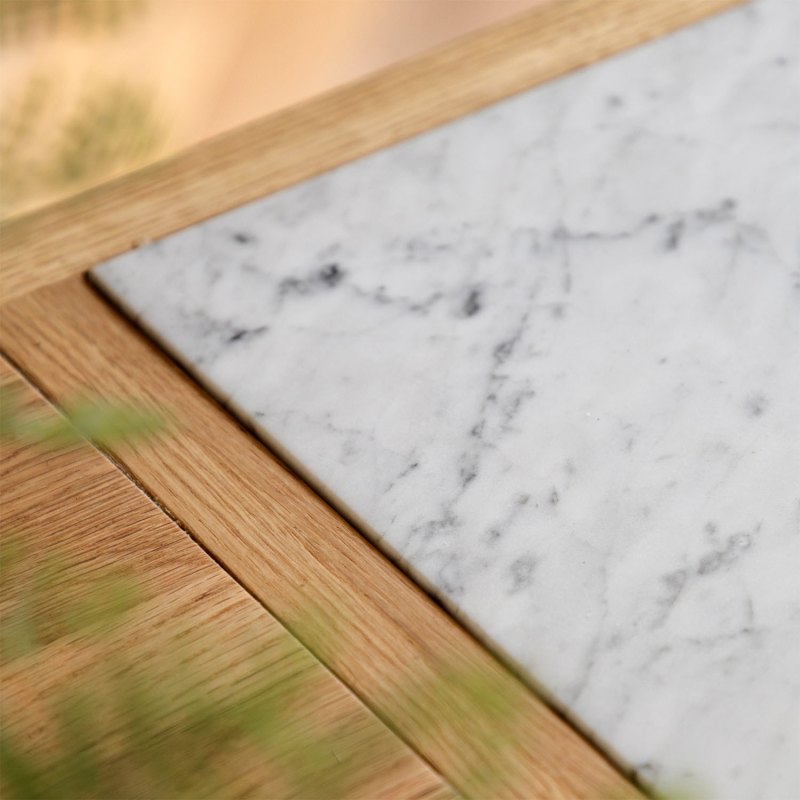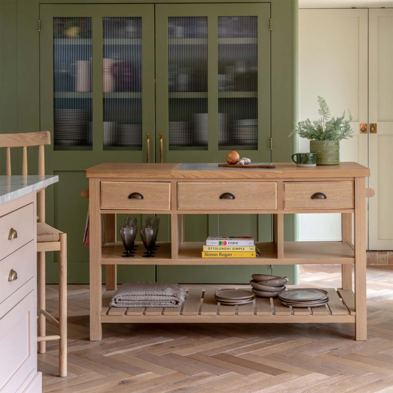 Add extra workspace and storage to your kitchen with the Ethan Oak Kitchen Island. Designed with a classic, country-inspired feel, it features a natural oak finish that brings warmth and character to the space. Three drawers, open shelving, a planked lower shelf and handy hanging rails provide plenty of practical storage, while the wood and marble inlaid top offers a durable surface for everyday prep. Due to the handmade nature of this product, colour variations may be present.