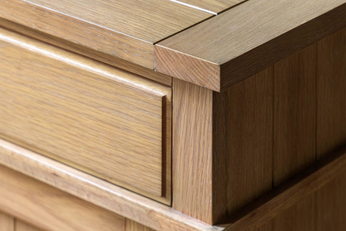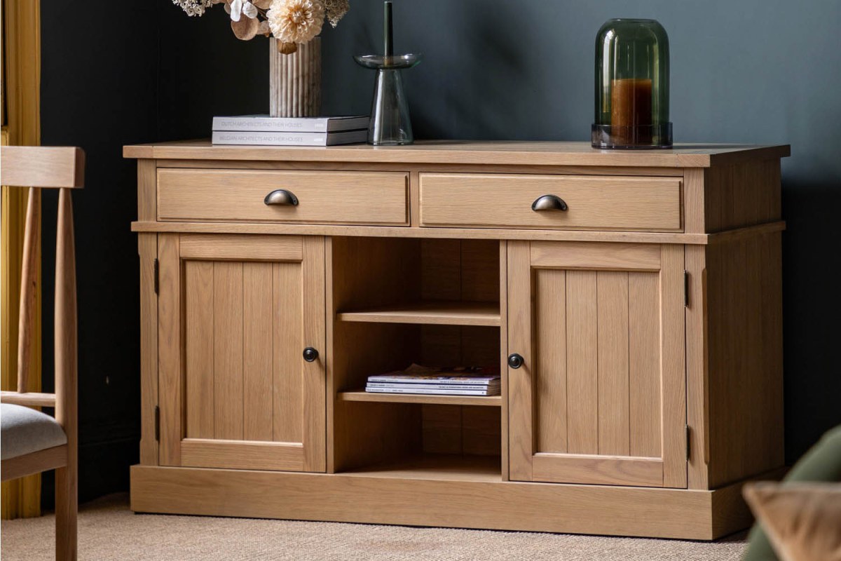 A practical storage piece with a relaxed country feel, this large sideboard is designed to keep your space organised without compromising on style. It features two drawers, two cupboards and open shelving, offering plenty of room for everyday essentials. The natural oak finish is paired with grooved cupboard doors and metal handles for added character and detail. Each piece is individually made, so natural variations in colour and grain add to its unique charm.
