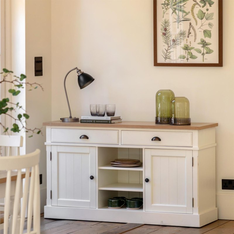 The Ethan White Large Sideboard brings together practical storage and a relaxed, country-inspired look. Finished in a soft white paint, it features two drawers, two cupboards and open shelving to keep everything neatly organised. Grooved cupboard doors and metal handles add subtle character, while the layout offers a mix of hidden and display storage for everyday living. Due to the handmade nature of this product, colour variations may be present.