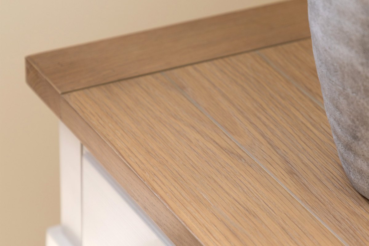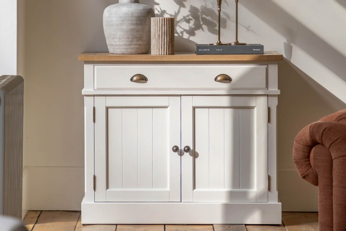 A practical storage piece with a nod to classic country style, this small sideboard fits effortlessly into both traditional and modern interiors. It features a spacious drawer and a two-door cupboard with adjustable shelving, giving you flexible storage for everyday essentials. The painted base is paired with a grooved, planked oak veneered top, while grooved doors and metal handles add subtle detail for a more updated look. Each piece is individually made, so natural variations in colour and finish add to its unique character. Also available in an all-oak finish.