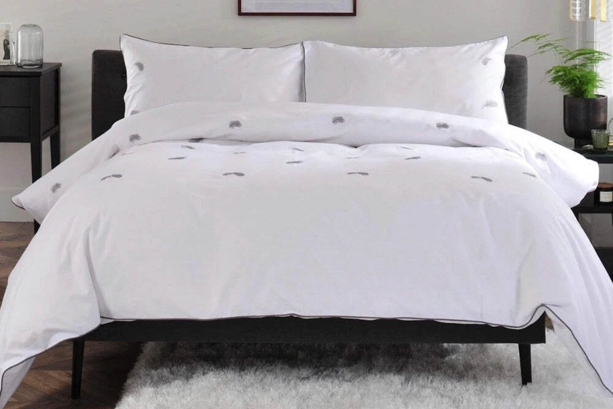 The Feather Embroidered Duvet Set brings a calm, understated look to your bedroom, combining simple detailing with everyday comfort. Made from 100% soft cotton, it feels naturally breathable and comfortable for a great night’s sleep. Delicate feather embroidery sits beautifully against a crisp white background, finished with a subtle piped edge for a refined touch. Easy to care for and designed to last wash after wash, this duvet set offers a fresh, relaxed style without compromising on quality or practicality. Available in double and king sizes.