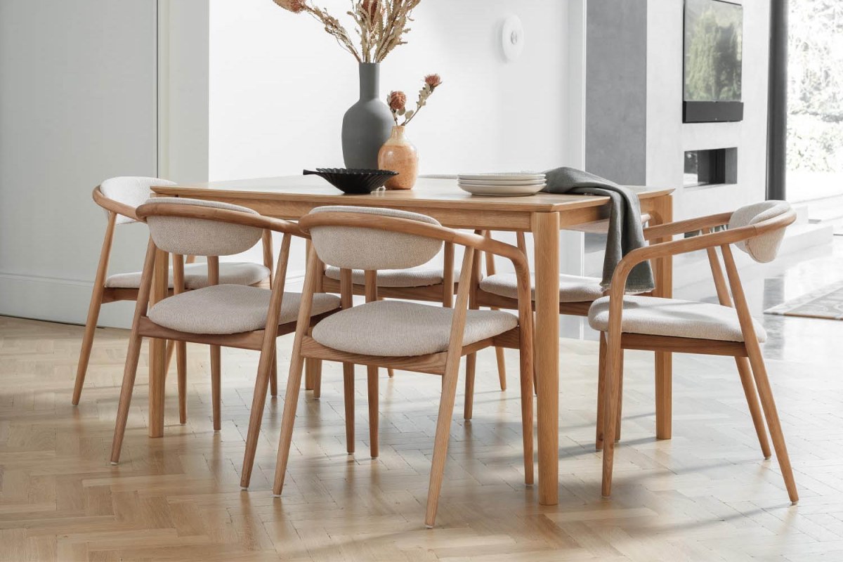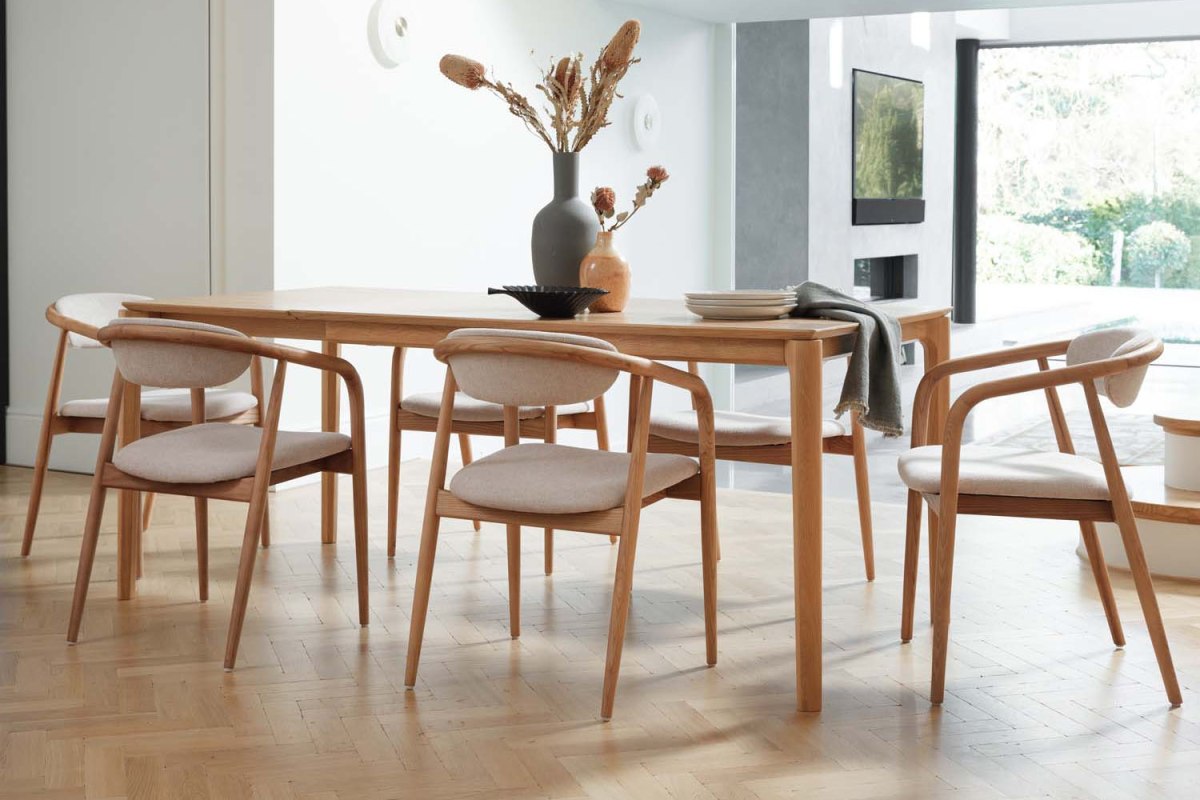 The G Plan Winchester 135–190cm Extending Dining Table combines elegant design with everyday practicality. Crafted from oak and oak veneers, it showcases the natural warmth and character of the wood, while the softly shaped edges and tapered legs create a light, refined look. The table extends smoothly from 135cm to 190cm, providing extra space when needed, making it perfect for both everyday meals and entertaining guests. Designed to pair beautifully with the rest of the G Plan Winchester collection, it helps create a stylish and coordinated dining space.