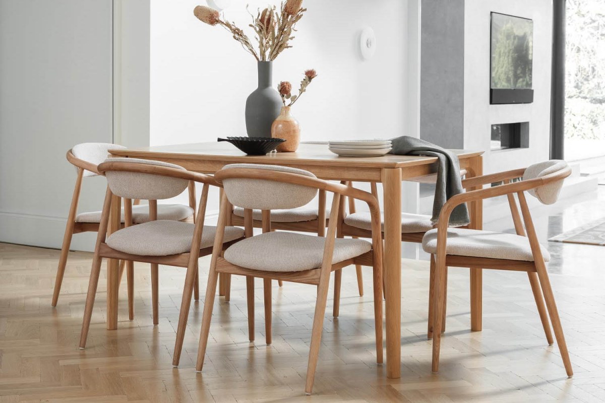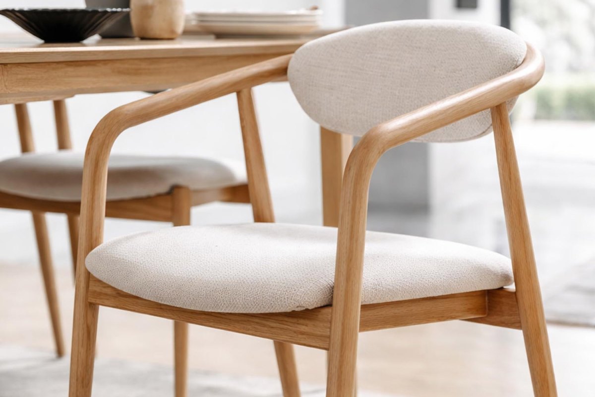 The Winchester Isabelle Dining Chair combines elegant design with everyday comfort. Crafted with a beautifully shaped solid oak frame, it features smooth curved arms and gently tapered legs for a refined, contemporary look. A padded seat and curved upholstered backrest provide excellent comfort and support, making it perfect for relaxed dining and entertaining. Finished in natural oak with soft fabric upholstery, the Isabelle chair pairs perfectly with the Winchester dining table to create a stylish, coordinated dining space.
