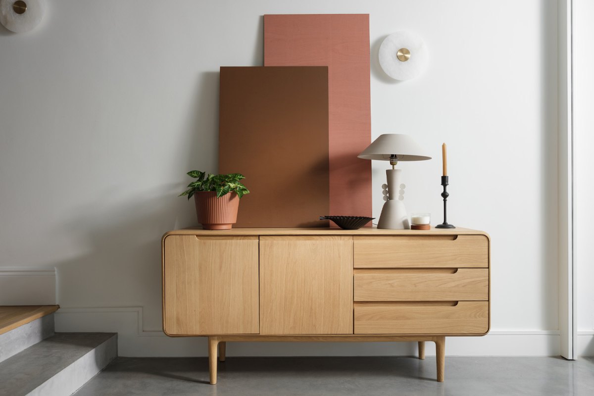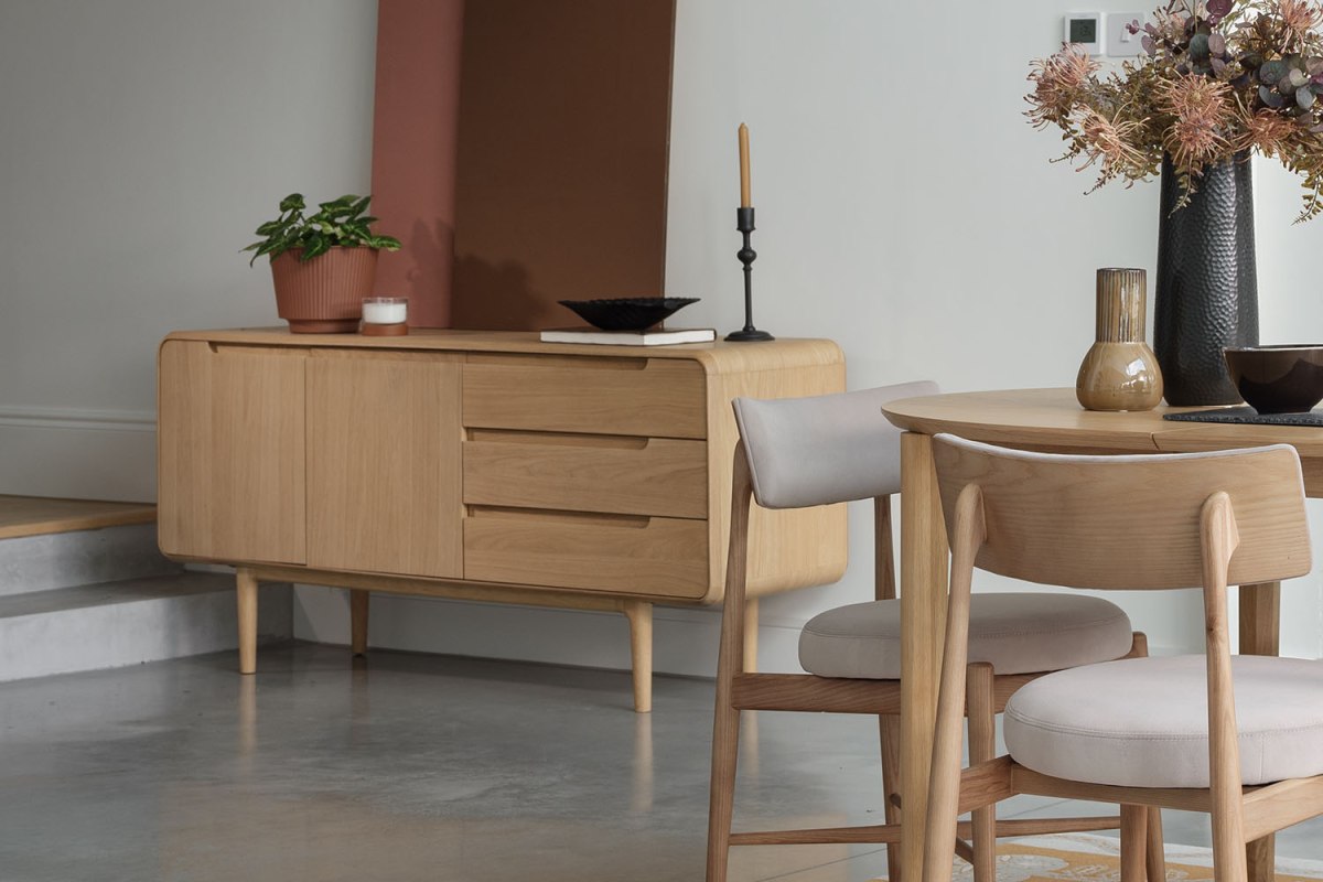 The G Plan Winchester Wide Sideboard combines elegant design with generous storage, making it a stylish and practical addition to any dining or living space. Crafted from oak and oak veneers, it highlights the natural warmth and character of the wood while the softly rounded edges and tapered legs create a light, refined look. Inside, the spacious cupboards provide plenty of room for storing tableware, while three drawers offer convenient space for smaller items such as cutlery or accessories. Designed to coordinate with the rest of the G Plan Winchester collection, this sideboard helps create a beautifully cohesive look throughout your home.