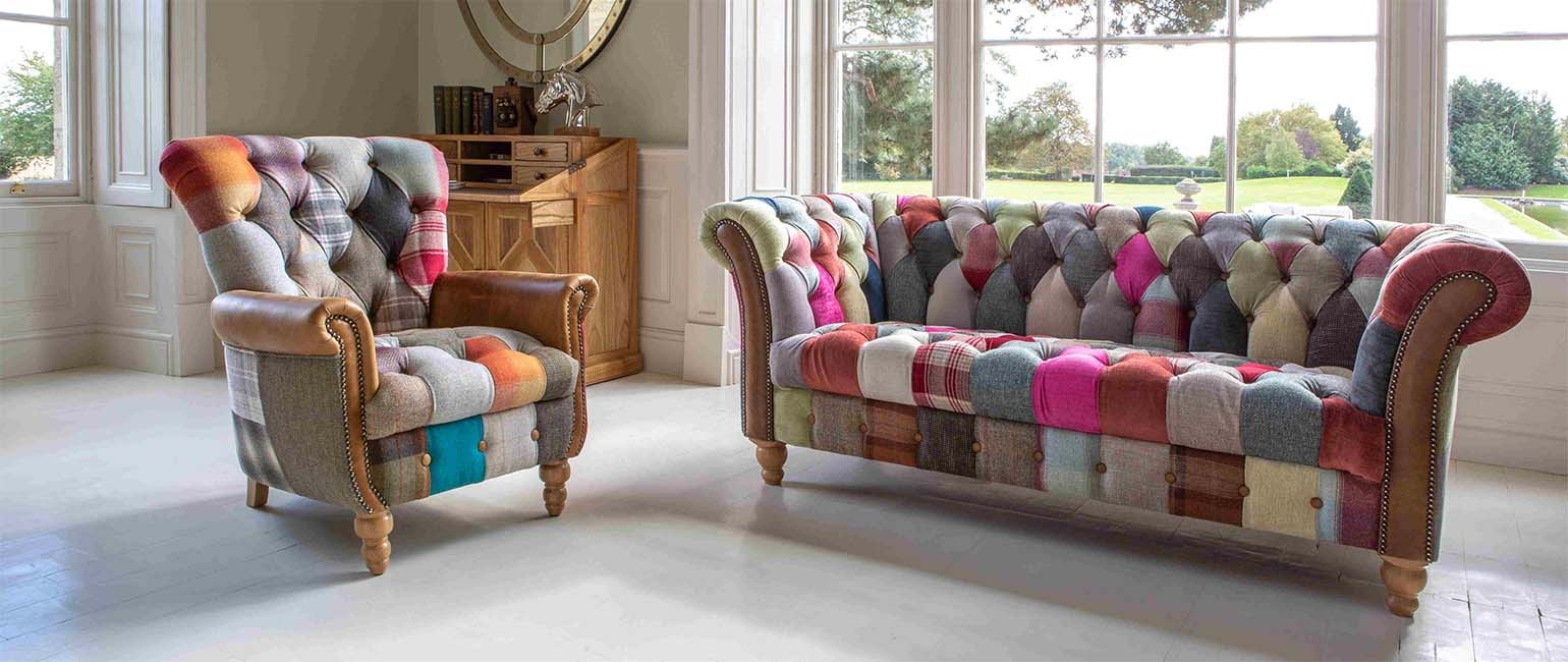 The Grantley collection makes a real statement, adding an element of joyful colour to your room. The classic Chesterfield design is expertly upholstered in a mix of genuine Harris Tweed, wool and real leather. The idea arose from a desire to use the offcuts of material that accumulate when making upholstery, and it has proved a gem of an idea and the result is a range of very desirable, and totally unique pieces.