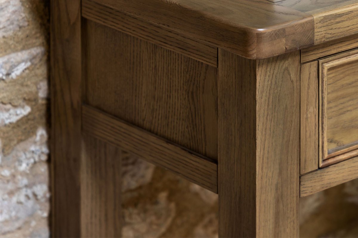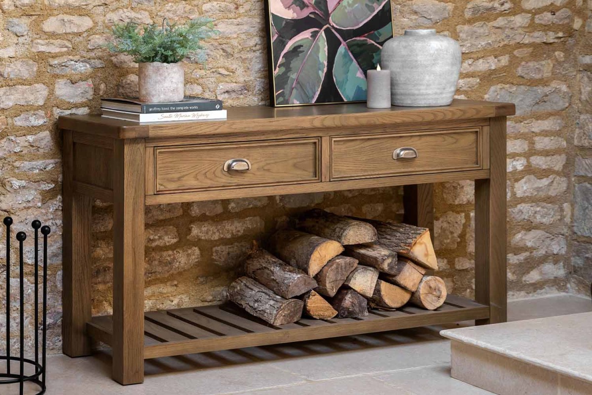 The Haddon 2 Drawer Console Table brings together practical storage and classic styling. With two generous drawers finished with traditional metal handles and a useful slatted lower shelf, it offers plenty of space for organising and displaying your essentials. Crafted from oak solids and veneers, the warm wood finish showcases the natural grain, making this a welcoming addition to hallways, living areas, home offices and beyond.
