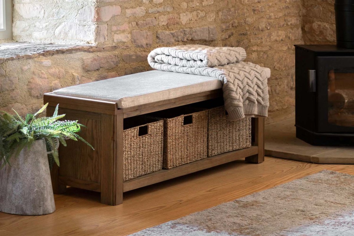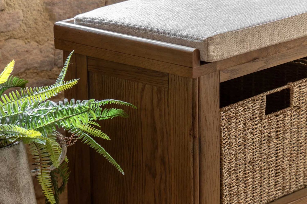 The Haddon Hall Bench brings together practical storage and comfortable seating in one stylish piece. Ideal for hallways, living rooms or utility spaces, it features three natural wicker baskets to keep everyday clutter neatly tucked away. Crafted from oak solids and veneers, the warm wood finish showcases rich grain detail, while the padded neutral-tone seat adds a soft, inviting touch. A relaxed and functional addition to any home.