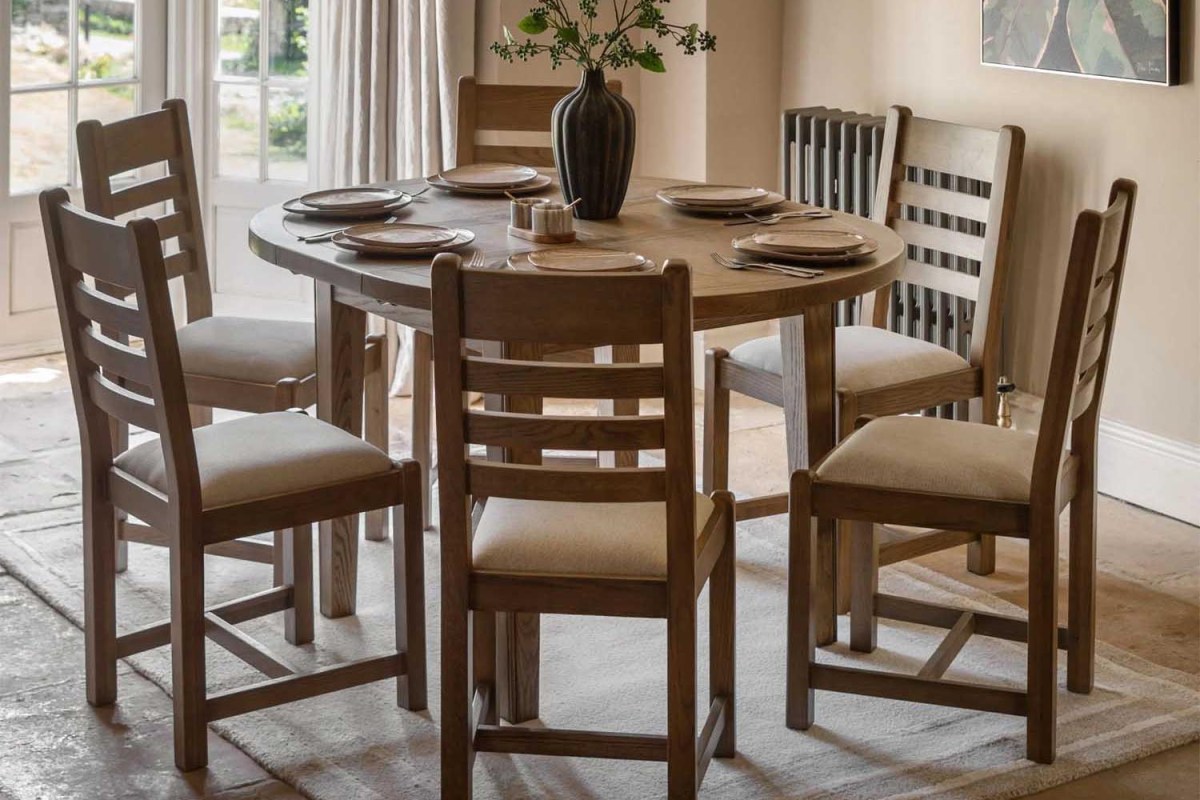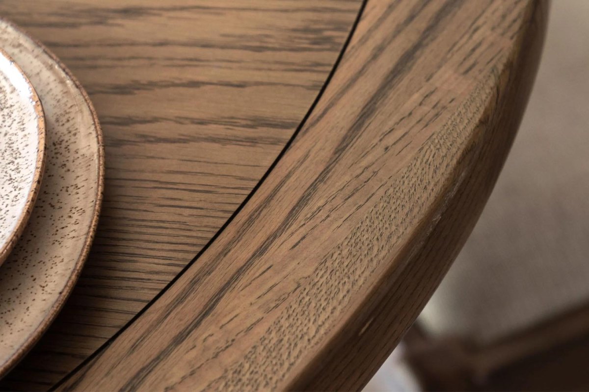 The Haddon Round Extending Dining Table brings warmth and character to any dining space. Crafted from oak solids and veneers, its natural wood finish highlights the grain and complements the table’s elegant design. The smooth extension mechanism allows you to shift easily from everyday meals to larger gatherings, offering a blend of beauty and adaptable functionality for modern family living.