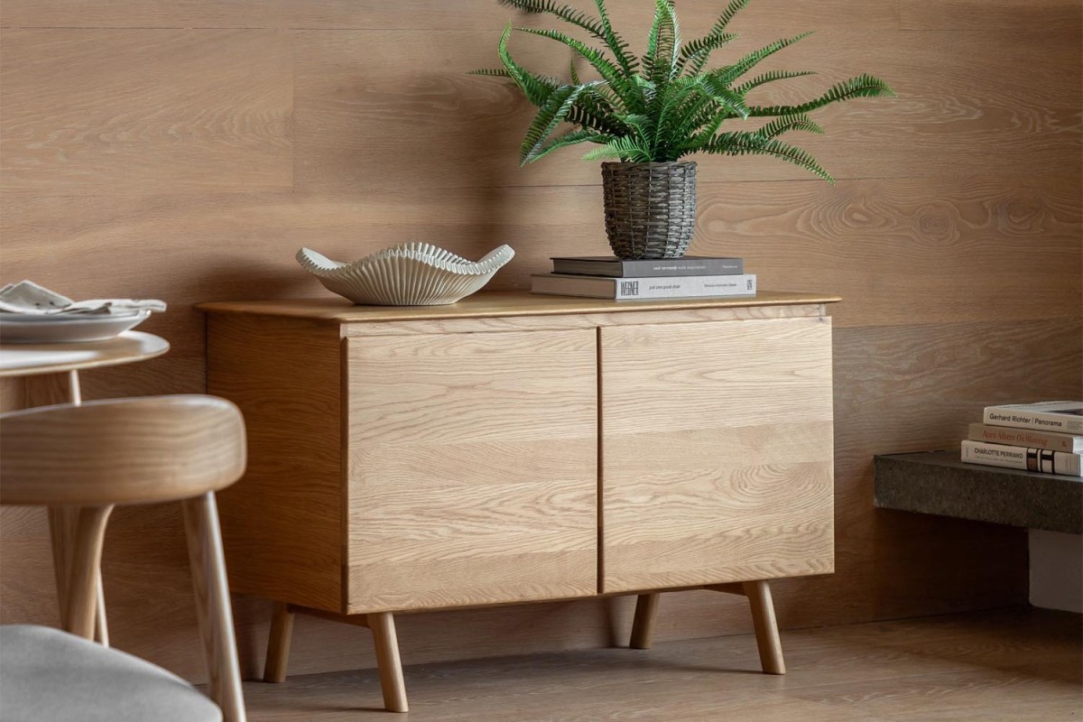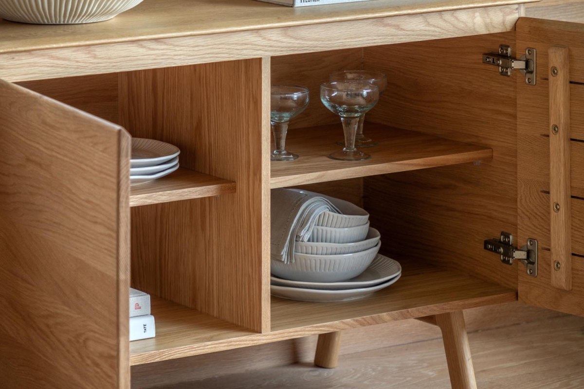 A clean, mid-century look with everyday practicality built in. Crafted from solid oak, this sideboard highlights the wood’s natural grain and warm, light tones, helping your space feel calm, fresh, and effortlessly modern. Two generous cupboards provide easy storage for the essentials you prefer to keep neatly tucked away, while the tapered legs give the piece a light, refined presence. A versatile addition that brings brightness, character, and clutter-taming charm to living rooms, dining spaces, or hallways.