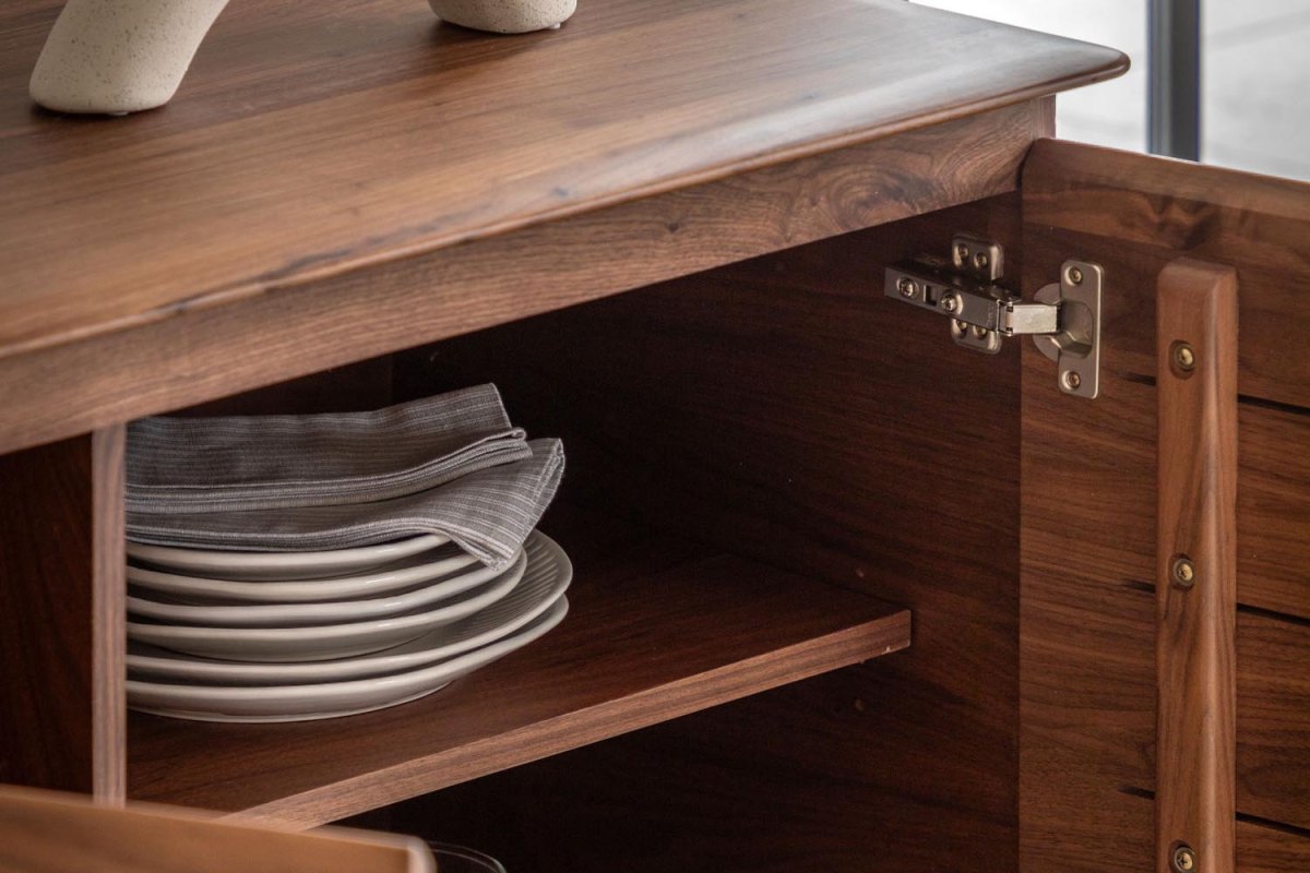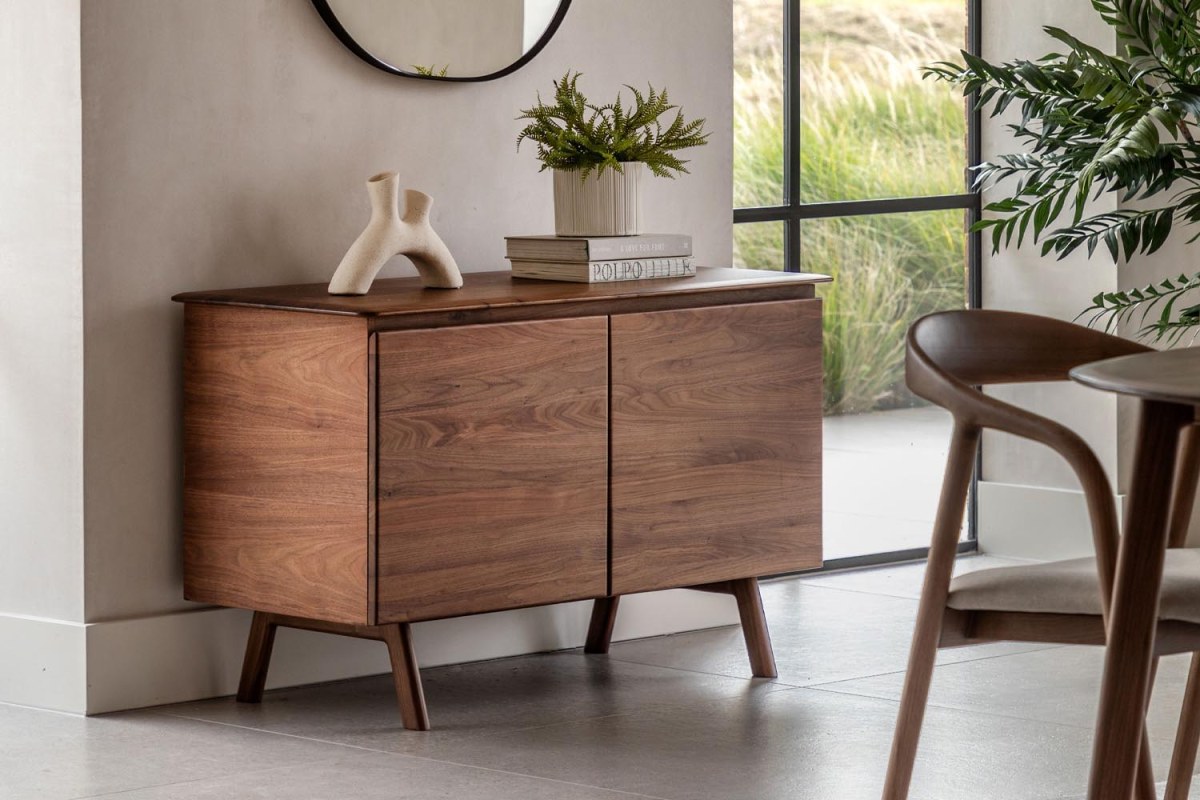 A clean, mid-century look with everyday practicality built in. Crafted from solid walnut, this sideboard showcases the wood’s rich tone and natural grain while keeping your space feeling fresh and modern. Two roomy cupboards offer easy storage for the bits and bobs you’d rather keep out of sight, and the distinctive tapered legs give it a light, refined stance. A versatile piece that brings warmth, character and clutter-taming charm to any living room, dining area, or hallway.