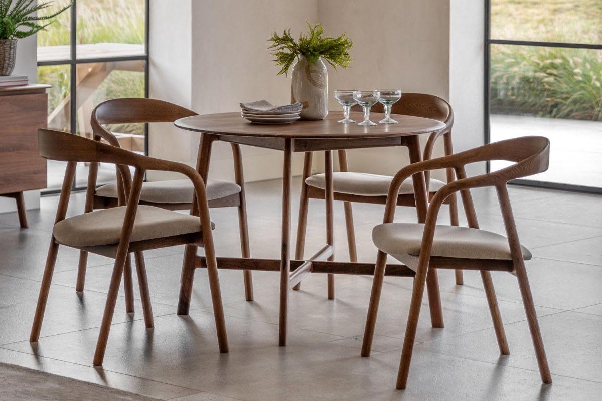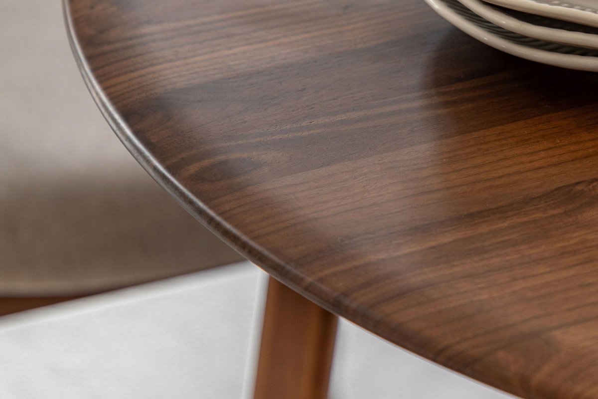 Designed to make an impression, this round dining table brings classic mid-century inspiration into the modern home. Made from solid walnut, it showcases the wood’s rich tone and beautiful natural grain, while smooth, curved edges create a welcoming and contemporary feel. A stylish centrepiece for anything from quiet breakfasts to lively dinner parties — warm, striking, and built to be enjoyed every day.