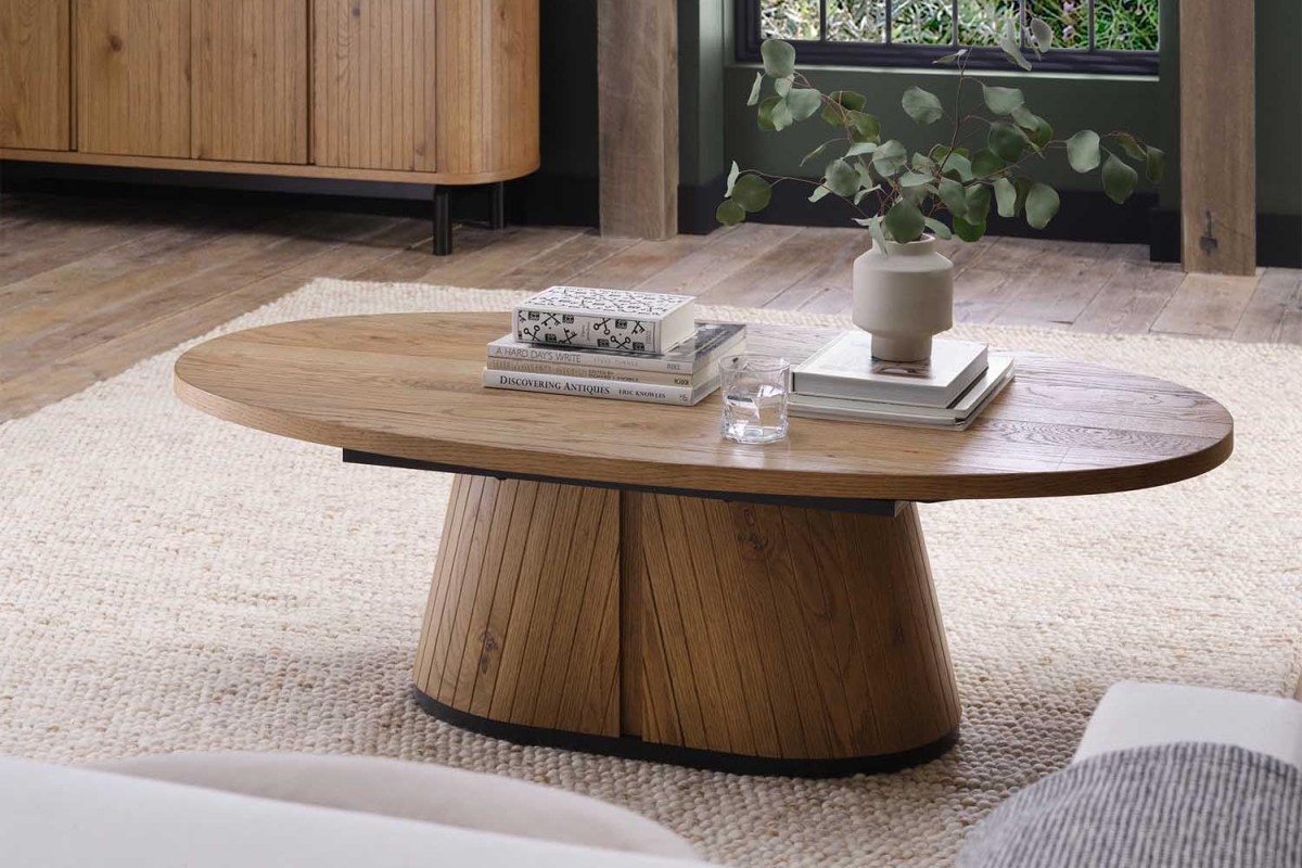 The Nielsen Rustic Oak Oval Coffee Table brings a warm, natural feel to your living space. The smooth oval top offers generous surface space for everyday use, while the sturdy pedestal base adds a distinctive focal point.