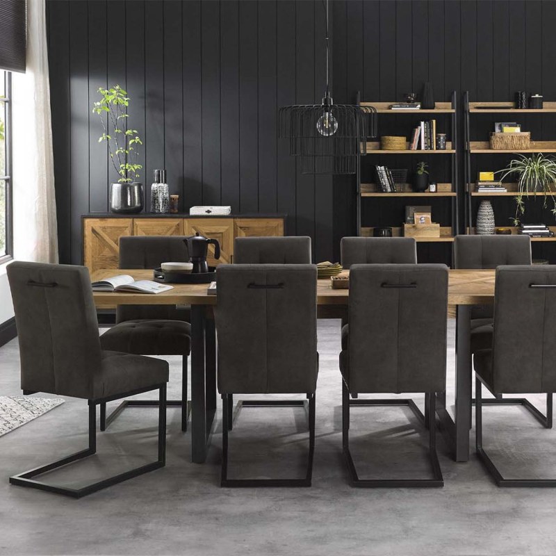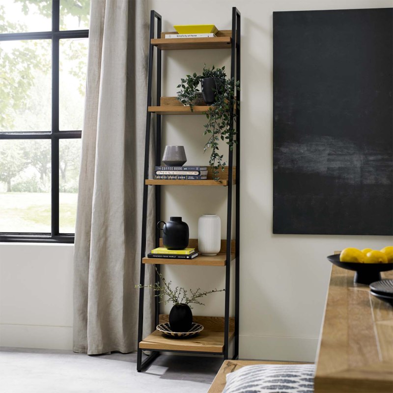 Designed to fit neatly into smaller spaces, the Ravi Narrow Bookcase provides open shelving for books, ornaments, or display pieces. The rustic oak shelves are framed with peppercorn oak veneer and supported by a bold black metal frame, creating a piece that’s both functional and stylish.