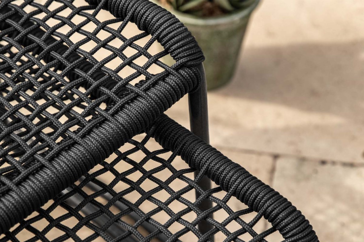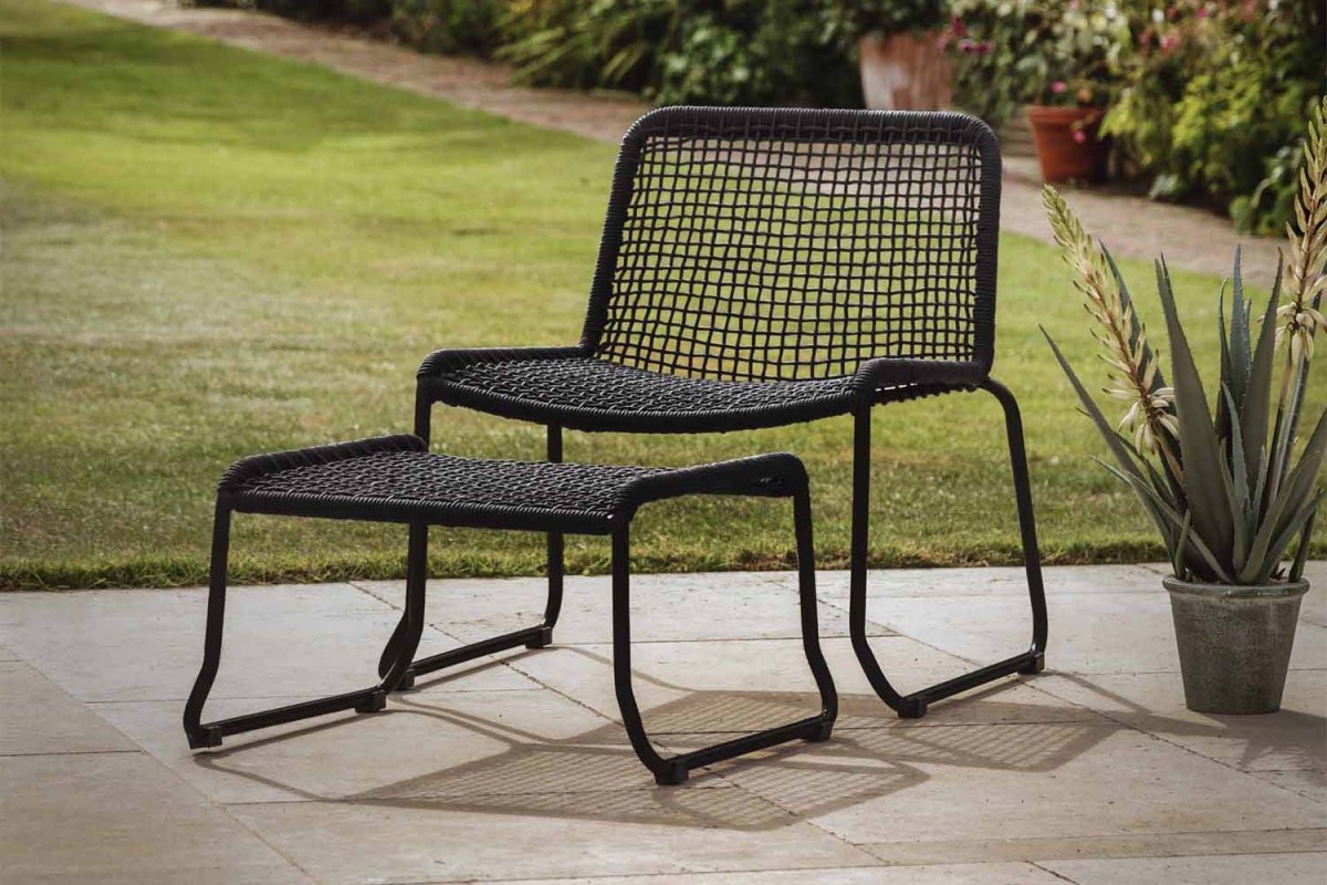 Sit back and unwind with the Siderno Lounge Chair with Footstool in black. With its relaxed shape and bold, modern finish, it brings a sleek, contemporary feel to any outdoor space. The woven rope seat and back add comfort and texture, supported by a sturdy steel frame for everyday durability. Paired with a matching footstool, it’s perfect for putting your feet up and relaxing outdoors. Also available in a range of other colours.