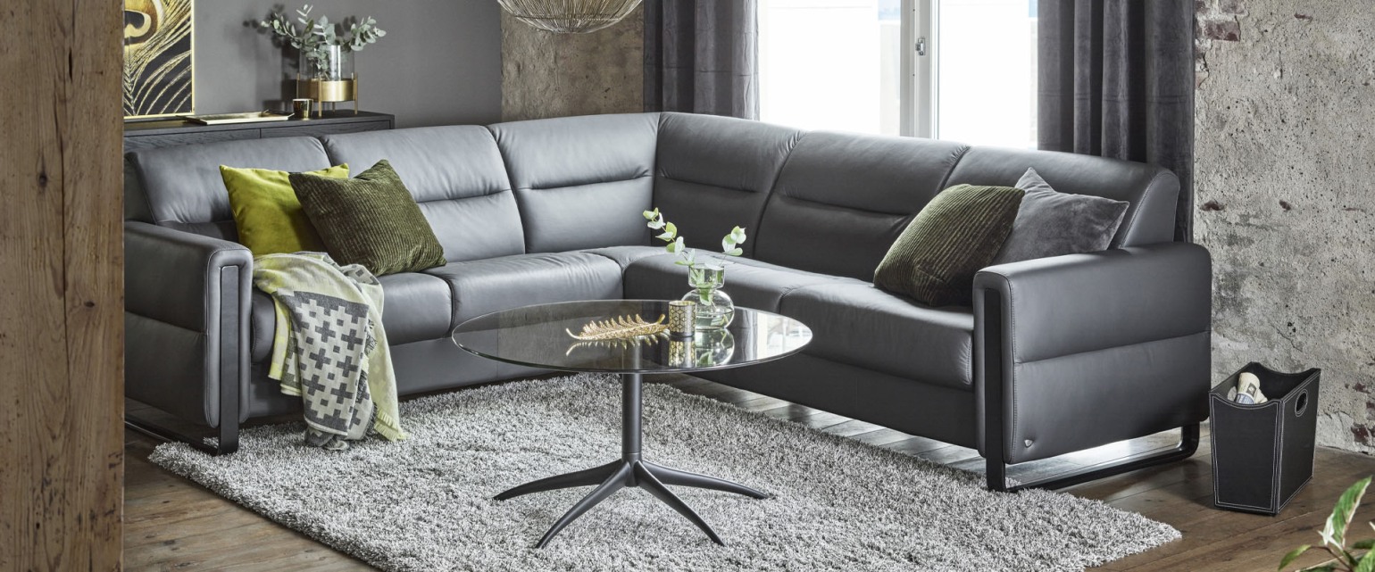 The Stressless® Fiona Corner Sofa offers a refined, contemporary design with perfectly balanced proportions. Its gently sloping back features subtle horizontal stitching, while the stylish steel arm details extend elegantly to the floor, creating a sleek and distinctive feature.