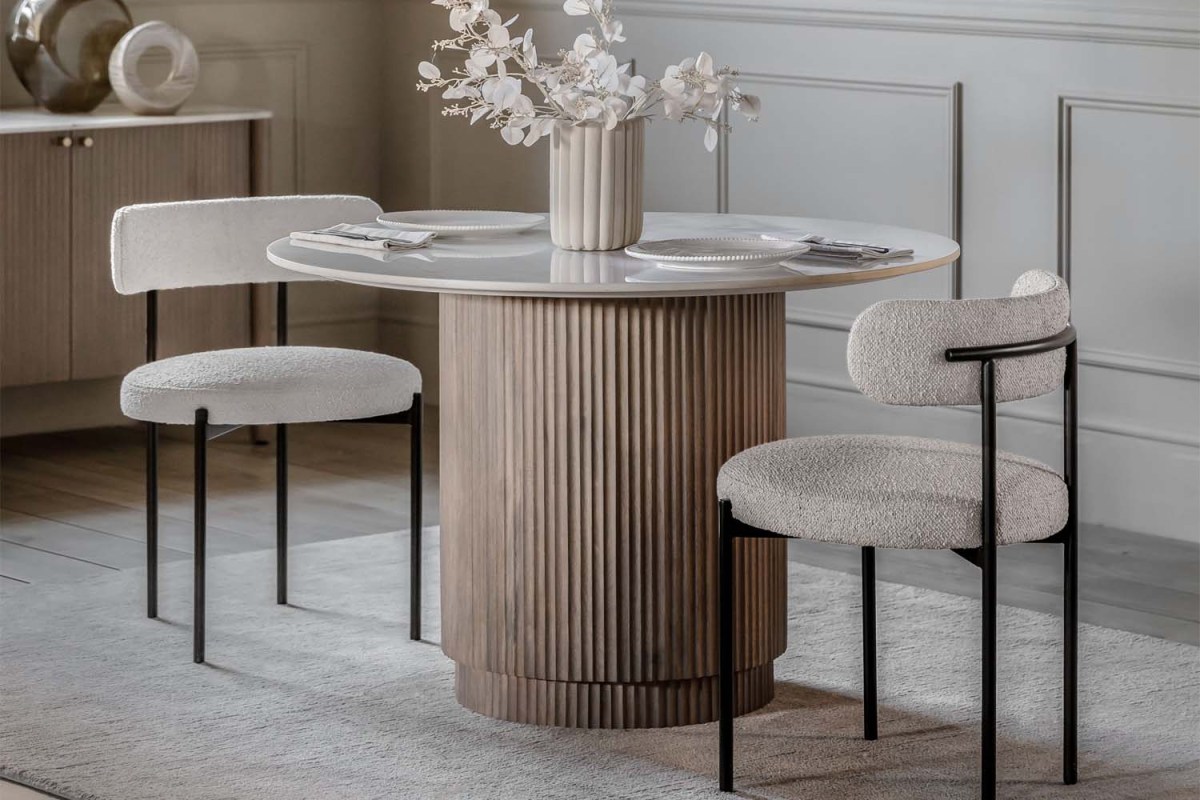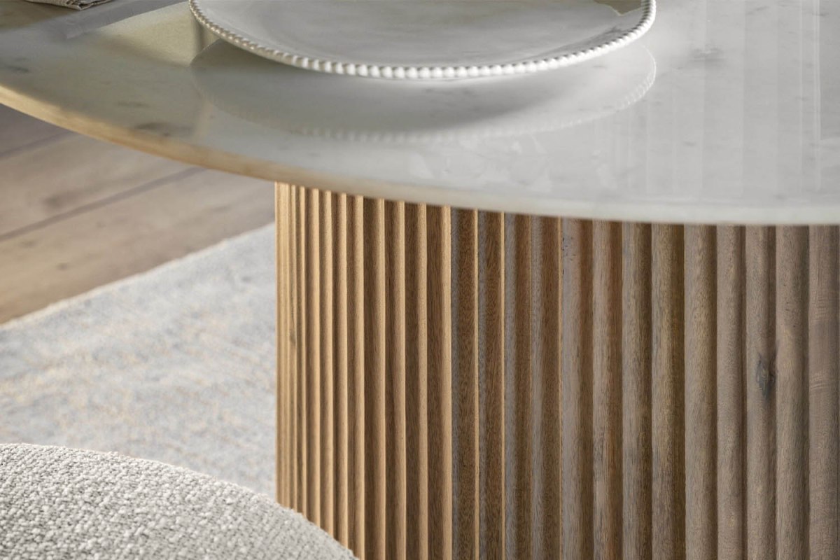 Elegant, inviting, and designed to make every meal feel special. The Striata Round Dining Table features a solid mango wood drum base with bold vertical ribbed detailing, giving it a sculptural, modern classic style. Finished with a polished Indian white Carrara marble top, traced with soft grey-blue veining, it brings a touch of luxury to any dining space. Complete the look with coordinating pieces from the Striata collection.