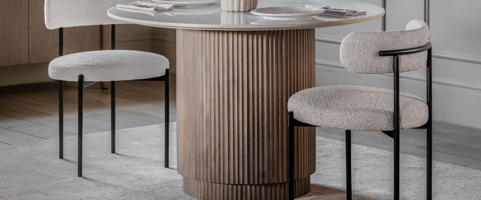 Elegant, inviting, and designed to make every meal feel special. The Striata Round Dining Table features a solid mango wood drum base with bold vertical ribbed detailing, giving it a sculptural, modern classic style. Finished with a polished Indian white Carrara marble top, traced with soft grey-blue veining, it brings a touch of luxury to any dining space. Complete the...