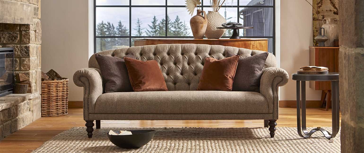 The Arbroath from British brand Tetrad is a traditional design, with a softly shaped back and classic deep buttoning detail. Arbroath looks stunning in all Harris Tweed or all leather, but also works well in a mix of Tweed with leather arms that really highlight the deep buttoning.