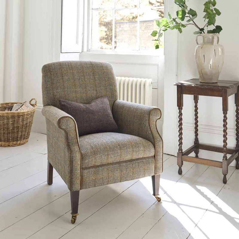- Available in Harris Tweed fabric or Mara velvet* with leather piping detail, or self-piped