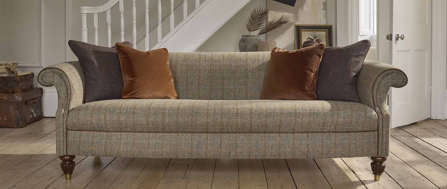 The Bowmore from Tetrad's Harris Tweed collection is an Edwardian style chesterfield sofa combining elegant curves and simple lines. The fully coil sprung seat provides the ultimate in comfort with support that lasts. It is available in a choice of genuine Harris Tweed fabrics or sumptuous Mara velvets, and comes with the option of leather piping details and elegant turned wood legs with brass ferrules.