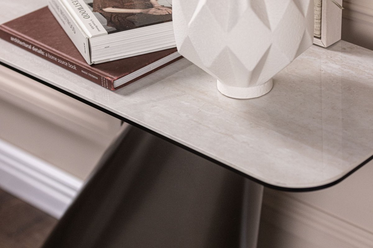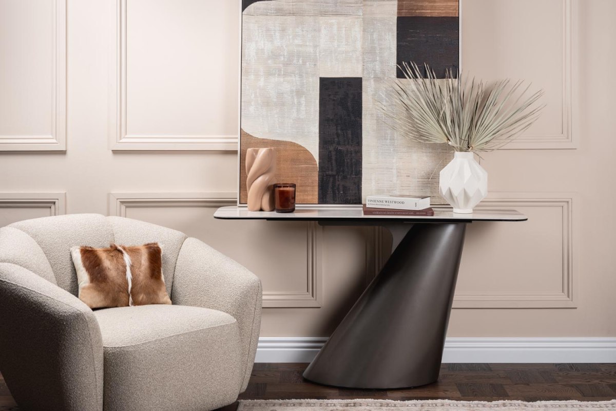 Refined and architectural, the Xavier Console Table makes a striking impression in hallways, dining areas, or living rooms. The angled bronze-finish base supports a slim, white stone-effect glass ceramic top, offering both durability and understated elegance. Perfect for showcasing statement décor or as a sophisticated accent piece.